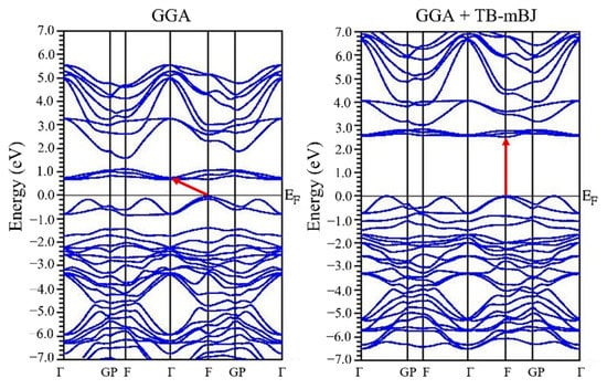 In a view to correct the description of the electronic properties, we implemented our calculations with the Tran and Blaha modified Becke–Johnson (TB-mBJ) exchange potential. The TB-mBJ approximation yields particularly good electronic properties [], with the achievement of an energy band gap of 2.5 eV, in good accordance with a literature review [,].