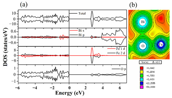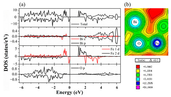 Figure 10a presents the total and partial density of electronic states of the BiFeO3 system calculated using the GGA + TB-mBJ approximation. It can be observed from the figure, that owing to the antiferromagnetic ordering considered in our calculations, the spin up and spin down channels are equal with a zero-net total magnetization. Note that both the valence band and the conduction band are constituted of oxygen 2p orbitals, iron 3d, and bismuth 6p orbitals, which reveal the strong Bi-O and Fe-O hybridization. In addition, we can conclude about a strong interaction between bismuth, iron and oxygen atoms, which is confirmed from the electronic density plot presented in Figure 10b. Indeed, Bi and Fe ions are observed to share covalent bonding with oxygen atoms.