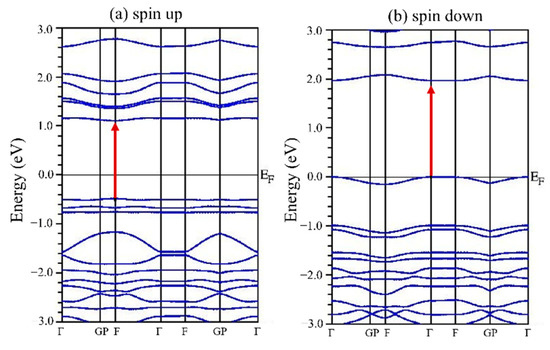 (a) Spin up, and (b) spin down channel of the band structure of BiFeO3 thin film.