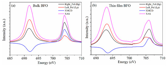 Besides, owing to the octahedral ligand field, the L2 and L3 peaks further split to t2g and eg states. Hence, through the deconvolution of the XAS curves we could extract the crystal-field splitting of the BFO system (i.e., energy difference between t2g and eg states). A crystal-field value of 1.24 and 1.02 eV was found for BFO thin film, and bulk, respectively, which indicates the presence of a different titanium octahedral environment. In addition, the use of circular polarized light in the X-ray magnetic circular dichroism study makes the absorption signal of the studied element (i.e., iron) sensitive to the magnetic moment. The blue line in Figure 13 illustrates the XMCD signal of Fe L2,3 edge which represents the difference value between the left and right circular polarized XAS spectra.