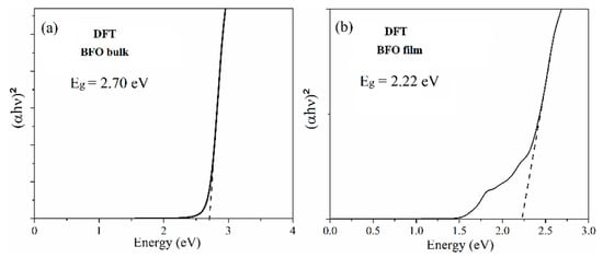 where ε1(ω) and ε2(ω) stand for the real and imaginary parts of the dielectric permittivity, respectively. Figure 14 illustrates the Tauc plots of the BFO system in its bulk and film form, extracted from DFT calculations. It is worth mentioning that in the last years there has been a great number of theoretical investigations reporting on the optical properties of bulk BFO system [,,,]. However, the reported band gap values, as recently demonstrated, are usually misestimated due to the used approximations (e.g., local density and generalized gradient approximations), leading to a truncated description of the strong Coulomb and exchange interactions in transition metal oxides []. For instance, using the local spin density approximation (LSDA), Neaton et al. [] reported an underestimated band gap of 1.9 eV, whereas using the Heyd–Scuseria–Ernzerhof (HSE) screened hybrid functional, Stroppa et al. overestimated the band gap of BFO system to 3.4 eV []. In this work, the use of the GGA + TB-mBJ approximation led us to approach quite well the experimental value [,], since we have found a direct optical band gap of 2.7 eV for the bulk BFO system (Figure 14a). Indeed, such approximation was previously demonstrated to reproduce rigorously the shape of the exact exchange potential for atoms []. In its thin film form, the band gap value of the BFO system was observed to decrease to 2.22 eV (Figure 14b), while keeping the direct band gap nature. Note that it is usually rather difficult to compare the theoretical results (e.g., band gap) of thin films to the experimental ones, since the properties are mainly dependent on various other parameters such as the particle size, morphology, and film thickness []. However, in our work the computed band gap value of BFO film appears to be in accordance with the experimental one. The decrease of the band gap in the film form is very interesting for photocatalytic applications, since it presents improved absorption in the visible light region.