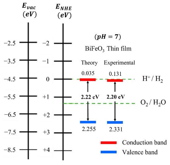 Figure 15 presents a comparison of the band alignment of BFO thin film computed using Equation (5) and the experimental one extracted from the Mott–Schottky plot at pH = 7. As shown in the figure, both valence and conduction band edges extracted theoretically and experimentally are observed to concord, where EVB is observed to be more positive than the reduction potential of water which allows the occurrence of the oxygen evolution reaction. Our results reveal the potential of reducing dimensionality in the BFO system and should motivate the development of low-dimensional BFO-based films as potential photocatalyst materials and photoanode for water splitting reaction.