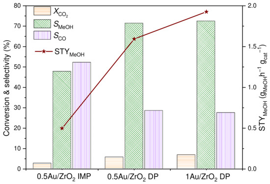 Both catalysts synthesized by the DP method showed a high conversion and selectivity of methanol compared to the catalyst synthesized by the IMP method. For DP-method catalysts, the increase in Au content increased the conversion of CO2 from 5.7 to 6.8%. However, the resulting selectivity of methanol appeared to be similar, with values of 71.5 and 72.5% for the catalyst samples with 1 and 0.5 wt.% Au loading, respectively. The STY of methanol increased from 1.6 to 1.9 gMeOH h−1 gcat−1 with the increase of the Au content. On the other hand, the 0.5 wt.% Au/ZrO2 catalyst synthesized by the IMP method showed the lowest activity (2.7% CO2 conversion) and less than 50% selectivity towards methanol. However, the highest selectivity towards the formation of CO as a side product was observed in the presence of this catalyst sample (Figure 1). The results obtained in this study are promising and in good agreement with the performance of Au-based catalysts reported in the literature (Table S1, Supplementary Information). The high WHSV value used in the performed experiments (i.e., 120,000 cm3 h−1 gcat−1) resulted in a high space–time yield. The carbon balance of the evaluated catalysts is 98, 96 and 96% for 0.5 Au/ZrO2 IMP, 0.5 Au/ZrO2 DP and 1 Au/ZrO2 DP, respectively.