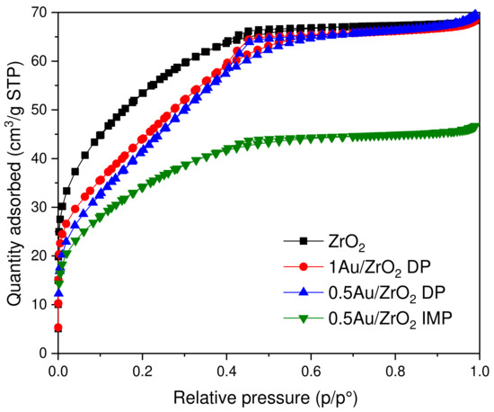 N2 adsorption–desorption isotherms of ZrO2 support and ZrO2-supported Au deposition precipitation/impregnation catalysts after reduction.