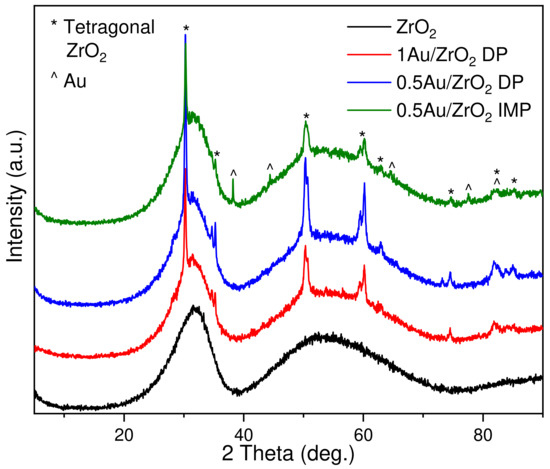 The phase composition of the catalysts reduced at 350 °C was analyzed by X-ray powder diffraction (Figure 3). In the XRD diffractogram of the ZrO2 support, we observed a broad peak at 2θ ≅ 30° and a second, lower-intensity peak at 2θ ≅ 50°; these diffractions were ascribed to the amorphous ZrO2 [44,45,46,47,48]. The addition of Au ensembles to the amorphous ZrO2 support showed sharp peaks at 2θ = 30.3, 35.3, 50.3 and 60.1°; these peaks were attributed to the crystallization of the amorphous ZrO2 support, i.e., the phase transformation of the amorphous to the tetragonal phase of ZrO2 (JCPDS card 01-080-0784). This phase transformation was perhaps induced due to the enhanced interaction between the metal and the support. A close observation of the intensities of these peaks reveals that they vary with the catalyst preparation method. Here, the catalysts synthesized by the DP method show high-intensity peaks compared to the solid synthesized by the IMP method. This indicates that the metal–support interactions are enhanced with the DP preparation method. It should be further noted that the Au cubic (fcc) phase was observed at 2θ = 38.2, 44.4. 64.5, 77.6 and 81.8° (JCPDS Card No. 04-0784) only in the IMP synthesized catalyst but not in the case Au/ZrO2 DP samples. The identification of the Au cubic phase in the 0.5 Au/ZrO2 IMP catalyst indicates the bulk cluster formation of Au in the case of the IMP method of preparation, in spite of the low Au loading. This is in accordance with the results of the N2 physisorption analysis (Table 1 and Figure 2), in which we observed a severe pore blockage in the 0.5 Au/ZrO2 IMP catalyst.