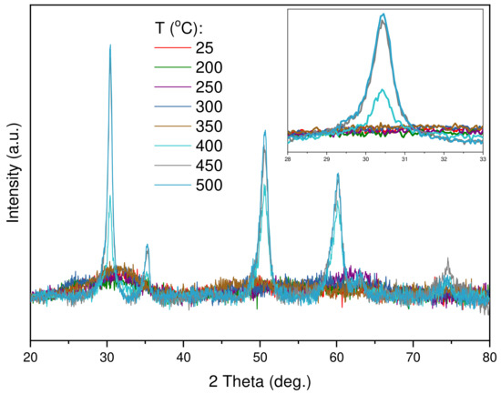 The in situ X-ray diffraction study of the reduction of amorphous ZrO2 was conducted with 5% H2-balanced Ar at temperatures ranging from 25 to 500 °C; the obtained results are depicted in Figure 4. From the inset graph of Figure 4, we can conclude that the amorphous ZrO2 shows no phase transformation during the temperature rise from 25 to 350 °C. The first phase transformation was observed at T = 400 °C, and continued to high crystallinity with the further temperature increase, during which we observed high-intensity patterns at 2θ = 30.5, 35.3, 50.7, 60.2 and 74.5°. These XRD patterns were related to the JCPDS file 01-080-0784 of the tetragonal ZrO2 phase. Based on the above, we can conclude that the phase transformation of amorphous ZrO2 to the tetragonal ZrO2 phase occurring at 350 °C is mainly due to the interaction with Au metallic ensembles deposited on the catalyst surface. This is in agreement with the study of Horti et al., who investigated ZrO2 crystallization as a function of temperature, and observed that the crystallization of amorphous ZrO2 to different crystallographic forms of ZrO2 is dependent on the temperature of the calcination [46].