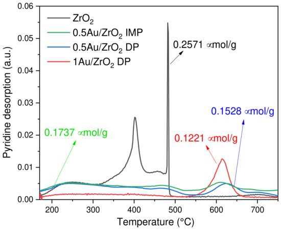 A classical technique of the temperature-programmed desorption of a basic probe molecule was used in the present study in order to obtain a quantitative estimation of the total number and nature of acidic sites on the surface of the reduced catalysts. Usually, a suitable basic probe is pre-adsorbed on the catalyst surface until dynamic saturation, followed by desorption with an increasing temperature. In this study, pyridine was used as a basic probe molecule, and its adsorption and desorption were monitored by a TG device (the change of weight). Furthermore, the obtained derivatives of weight are presented in Figure 5, while Table 2 shows the quantified total acidity values of the reduced catalysts. The bare ZrO2 support showed high total acidity with 0.2571 µmol/g uptake of pyridine compared to Au-containing catalysts. The values of the total acidity of 0.1737, 0.1528 and 0.1221 µmol/g were obtained for 0.5 Au/ZrO2 IMP, 0.5 Au/ZrO2 DP and 1 Au/ZrO2 DP catalyst samples, respectively. However, it is clear from Figure 5 that the strength of the surface acidic sites is different for each catalyst. Concerning the bare ZrO2 support, different desorption peaks were observed at 248, 402, 458 and 481 °C. The first low-temperature desorption peak is due to the early desorption of pyridine from the surface; this little hump is due to the presence of weak acidic sites. Furthermore, the sharp high-intensity and a low-intensity desorption peaks occurring at 402 and 458 °C are due to the moderately strong acidic sites [49,50,51,52,53], and finally, the peak at 481 °C is due to the phase change from the amorphous to the cubic ZrO2 phase. On the other hand, the addition of 0.5 wt.% Au showed a noticeable change in the character of the acidic sites. In both 0.5 Au/ZrO2 DP and 0.5 Au/ZrO2 IMP catalysts, three main desorption peaks were observed at 243, 473 and 610/624 °C (IMP/DP Tmax). The weak acidic sites were observed as it was in the case of the bare ZrO2 support, but the moderately strong acidic sites were shifted to higher temperatures, indicating that the strength of the acidic sites was increased with the Au addition, which is due to the change in the metal–support interaction. A new desorption peak appeared at 610 and 624 °C for IMP and DP-based 0.5 Au/ZrO2 catalysts, respectively. This high-temperature peak indicates the presences of strong acidic sites. It can be seen that the 0.5 Au/ZrO2 DP catalyst exhibits stronger acidic sites compared to the 0.5 Au/ZrO2 IMP sample. Finally, Figure 5 demonstrates that the 1 Au/ZrO2 DP catalyst shows only one pyridine desorption peak, which appears at a high temperature, i.e., 618 °C. This implies that there were only strong acidic sites present on the surface of this solid.