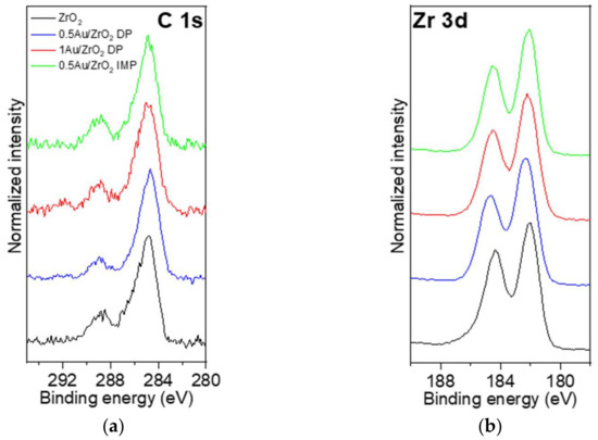 The quantification of the relative atomic and weight concentrations was performed based on the measured high-resolution XPS spectra. The concentrations were normalized to 100.0%. The atomic ratio of Zr:O is close to 2:1, and therefore corresponds well to the ZrO2 compound (Table S2, Supplementary Information). The slightly more than two-times higher atomic concentration of O relative to Zr is due to the additional contribution of the oxidized carbonaceous species present on the surface (the high binding energy peak at 288.5 eV corresponding to the COO–/COOH species, and a high binding energy shoulder at 286.5 eV of the main peak in the C 1s spectra corresponding to the C-O/C=O species, Figure 8a). The positions of the Zr 3d3/2 and Zr 3d5/2 peaks are at 182.0 eV and 184.4, respectively, corresponding to a ZrO2 compound. The shape and position of the peaks in the Zr 3d spectra of all four samples are at similar binding energies, indicating a similar environment of the Zr-containing compound, i.e., ZrO2 (Figure 8b). The main peak in the O 1s spectra (Figure 8c) is located at 529.9 eV, and originates from ZrO2. The high-energy shoulder of the main peak in the O 1s spectra originates from oxidized adventitious carbonaceous species (Figure 8c). Although the powder samples contained only a small amount of Au, the signal for Au 4f was detected for all of the samples (Figure 8d), with the highest Au content found in the 1 Au/ZrO2 DP sample (Table S2). The relative atomic concentration of Au was the same for the 0.5 Au/ZrO2 DP and 0.5 Au/ZrO2 IMP samples, while this concentration was higher for the 1 Au/ZrO2 DP solid (Table S2). Therefore, the atomic concentration ratio of Au:Zr was significantly higher for the sample of 1 Au/ZrO2 DP than for samples of 0.5 Au/ZrO2 DP and 0.5 Au/ZrO2 IMP. Moreover, the weight surface concentration of Au reported in Table S2 for the 1 Au/ZrO2 DP sample was higher than the actual loading. The deviation from the actual and measured Au atomic/weight percentages most likely means that Au is preferentially located on the surface of the powdered particles, and therefore more Au is detected in the XPS measurements (this technique obtains the signal from approximately 5 nm in depth). Concerning the samples of 0.5 Au/ZrO2 DP and 0.5 Au/ZrO2 IMP, no surface enrichment of the catalyst particles with gold ensembles was observed.
