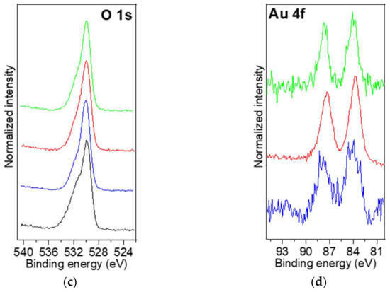 Figure S4 (Supplementary Information) shows the survey spectra for the four powder samples. All of the survey spectra show signals for O 1s, Zr 3s, Zr 3p, and Zr 3d, corresponding to ZrO2. A minor contribution to the O 1s signal also originates from the oxidized adventitious carbonaceous species. The C 1s signal, which was present in all of the survey spectra, originates from adventitious carbonaceous species adsorbed on the powder samples after the preparation procedure and during the transport of the sample to the XPS spectrometer. The C 1s signal disappeared when sputtering was performed using both 20 Ar500+ cluster and 5 keV Ar+ sources, proving that the adventitious carbonaceous species were adsorbed on the surface of the powder samples. Samples that contained Au also show low intensity Au 4f peaks (for all of the survey spectra apart from the survey spectrum for ZrO2).
