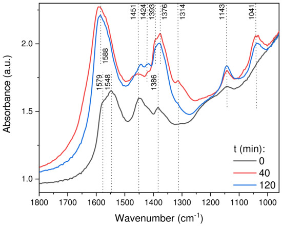 A carbonate region from 1800 to 950 cm−1 was considered as segment 1, which is presented in Figure 9. The initial spectrum at t = 0 min recorded before the introduction of the reaction mixture showed different carbonate bands appearing at 1579, 1451 and 1384 cm−1, which were attributed to the OCO vibration bands of the symmetric and asymmetric stretching of bidentate carbonate species present in the formate intermediate (-OOCH) [40,42,60]. A vibrational band at 1548 cm−1 further corresponded to the OC stretching vibrations of monodentate carbonate species present in the formate intermediate. This spectrum shows the initial formation of both bi- and monodentate formate intermediate species. A band at 1143 cm−1 was also observed as a broad peak that appeared due to the stretching vibrations of OC in the OCH3 intermediate species. After 40 min of the reaction mixture being fed, a considerable change was identified in the surface carbonates. The spectrum at 40 min shows high-intensity vibrational bands at 1588, 1448, 1394 and 1314 cm−1 that were attributed to the formation of bidentate carbonate, whereas the formation of the monodentate OC stretching of OCH3 was observed at 1143 cm−1, and of the bidentate OC stretching of OCH3 at 1041 cm−1 [61]. Furthermore, a sharp shoulder peak occurred at 1378 cm−1, which is commonly referred in the literature as the C-H vibrational band in the formed formate species. The gradual surface changes under the reaction mixture with time can be clearly observed in Figure S6b; these changes illustrate the formation of intermediates and the further hydrogenation of the formate species. After the reaction mixture treatment for 40 min, the gas flow was changed to N2, and then a steady state was recorded at t = 120 min; the acquired spectrum shows a few more important intermediates. Along with different bidentate carbonate species, a new peak related to dioxymethylene (DOM) appeared at 1424 cm−1 [62]. The formation of this intermediate species indicates the slow hydrogenation of the formed formate intermediate during the steady state under N2 flow. Furthermore, the decrease of the 1041 cm−1 peak related to methoxy species indicates the formation of methanol, and the increase of the 1143 cm−1 peak suggests the formation of methoxy species due to the hydrogenation of surface formate intermediates. A steady growth in the vibrational bands of DOM and methoxy intermediates observed in Figure S7b illustrates the further hydrogenation of intermediates with time in the N2 gas flow.