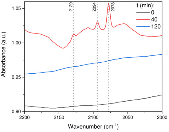 Segment 2, illustrated in Figure 10, represents the CO vibrational region. At t = 40 min, the catalyst showed vibrational bands at 2078, 2094 and 2129 cm−1 that were assigned to surface-adsorbed CO on the Au surface [37,63,64]. No peaks were observed in this region at 0 and 120 min, i.e., at the beginning of the reaction and at the end of the experiment under an inert gas flow, because the formation of CO was mainly due to the side reaction (RWGS, Equation (2)). This particular side reaction was highly possible when the reaction mixture was flowing; hence, there were no peaks observed in this region at 0 and 120 min. However, the FTIR spectrum obtained at 40 min shows the above-mentioned peaks, indicating that this side reaction accompanied the CO2 hydrogenation to methanol reaction even at 40 bar. Figure S6c shows that the CO vibrational bands progressively increase with time, which is attributed to the forward reaction in a CO2/H2 mixture flow. On the other hand, a continuous decrease of CO vibrational bands can be observed in Figure S7c, indicating that CO is produced in the reaction conditions, such that one can conclude that CO is formed is mainly due to the RWGS reaction.