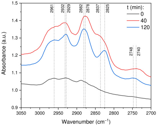 Furthermore, segment 3—displayed in Figure 11—shows peaks at 2961, 2932, 2878, 2837 and 2740 cm−1 that were attributed to the absorption of IR radiation by the C-H vibrations of different intermediates. The initial spectrum acquired at 0 min also showed similar peaks but of lower intensities. The spectrum recorded at 40 min shows these peaks that were denoted in the previous literature reports as C-H vibrations in formate and methoxy intermediates. The combination of the peaks at 1578, 1443, 1380 and 1314 cm−1 related to OCO vibrations, and the peaks occurring at 2881, 2974 and 2746 cm−1 corresponding to CH vibrations, collectively represent the formation of the formate intermediate [40,61]. Similarly, the combination of the peaks at 1039 and 1142 cm−1 appearing due to OC vibrations, and the peaks at 2931 and 2828 cm−1 related to CH3 vibrations, collectively indicate the formation of the methoxy intermediate [40,61]. In the spectrum acquired at 40 min, one can observe all of these peaks related to surface formate and methoxy intermediates. Figure S6d shows a gradual growth of CH vibrational bands, especially the band at 2828 cm−1, which is attributed to the continuous hydrogenation of surface intermediates in order to form the methoxy intermediate. On the other hand, after the continuous flushing of the catalyst with N2 for 80 min, the spectrum at 120 min showed an increased sharpness of the peaks at 2930 and 2825 cm−1, which correspond to the methoxy intermediate, indicating that the hydrogenation of the surface formate species was continuously taking place even under the N2 flow. Furthermore, continuous hydrogenation leads to the formation of a DOM intermediate, as observed in Figure 9; the same finding was supported with the occurrence of peaks at 1143 and 1041 cm−1. A similar phenomenon can also be observed in Figure S7d, where vibrational bands related to CH vibrations continuously increase with time in an N2 gas flow. This is another important observation that shows the hydrogenation of the intermediates even in an inert atmosphere.
