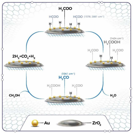 Proposed reaction mechanism of CO2 hydrogenation to methanol carried out in the presence of Au-based ZrO2 catalysts.