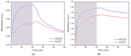 Temporal profiles for the HCOO* and H3CO* surface intermediates obtained during the in situ DRIFTS measurements carried out in the presence of (a) 0.5 Au/ZrO2 DP and (b) 0.5 Au/ZrO2 IMP catalysts. The shaded part represents the time period of the CO2/H2 reaction mixture flow, and the white colour represents the time period of the N2 flow.