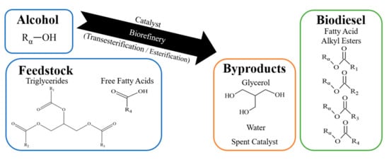 Vegetable oils and animal fats are typically used in food production, and therefore usage in the fuel industry would encourage undesirable competition, referred to as the issue of “food vs. fuel” [7]. Other non-edible, algal or waste cooking oils (WCO) could be used; however, issues of affordability and ensuring sufficient supply to meet an ever-growing demand would need to be addressed [8,9]. Impure feedstock such as WCO could potentially be both cheap and plentiful in supply, although high water and free fatty acid (FFA) content [10,11] requires resilient catalysts.