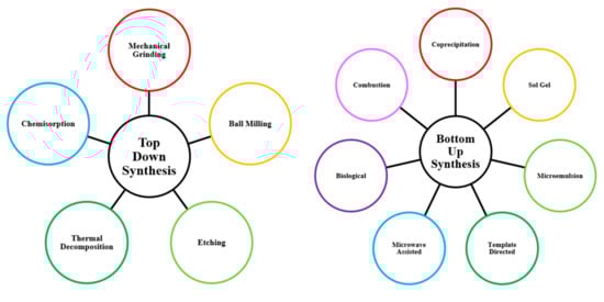 Acidic nanocatalysts can be developed through either a “top-down” or a “bottom-up” methodology [43]. Top-down methods begin with bulk material and gradually refine downwards into an engineered nanoscale structure, whereas bottom-up approaches begin at nanoscale and progressively build upwards to obtain a desirable catalytic nanostructure. A variety of synthesis routes have been explored in past literature, as summarized in Figure 4 below. It is important to carefully consider which production strategy to utilize, since biodiesel yield depends on sufficient catalyst surface area and porosity to ensure effective mass transport of reactants towards active sites [44]. The stability of active sites against leaching, poisoning and other deactivation effects can also be influenced by the synthesis route performed, impacting the maximum recyclability that is achievable [45]. Unfortunately, it is difficult to predict which approach will be optimal or what the best synthesis conditions should be ahead of time; therefore, significant work continues to explore how best to synthesize optimal nanocatalysts with both impressive reactivity and reusability.
