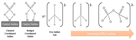 Sulfation not only increases Brønsted acid behaviour, but can enhance the Lewis acidity of metal-based solid catalysts through the inductive effect, drawing even more electron density away from the metal cation and increasing the ability for electron pair acceptance to occur. The sulfate ion (SO42−) can exist in a variety of forms: for sulfated metal oxides this includes a chelated, bridged, or free ion structure [53], as illustrated in Figure 5. The sulfate loading achieved can influence the Brønsted/Lewis ratio, with high loadings favouring polynuclear sulfate structures with more Brønsted sites present [54]. The total acid site density and Brønsted/Lewis ratio can be experimentally determined via techniques such as ammonia temperature programmed desorption (TPD) [55] and pyridine diffuse reflectance FTIR spectroscopy (DRIFTS) [38], respectively.