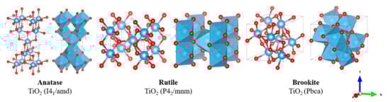 Titania enjoys a wide range of commercial application, such as: water and air purification systems, use as a white pigment, cosmetics and sunscreen, sensors, and self-cleaning films. Alongside being a widely researched photocatalyst, a desirable surface area combined with strong physical and chemical stability makes titania an excellent choice for a reactive catalyst support [95]. Sulfated titania has hence been widely studied as a solid acid catalyst for biodiesel production [78]. Titania exists in three main forms known as anatase, rutile and brookite, as displayed in Figure 7.