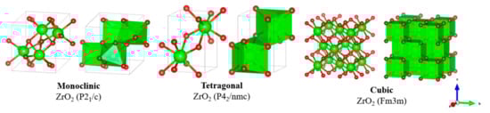 Zirconia is an important ceramic material, commonly used in fields such as dentistry, nuclear power, and catalysis, due to high mechanical and chemical resilience [106]. Similar to titania, the sulfation of zirconia to introduce Brønsted acidity has been widely explored as a solid acid nanocatalyst for biodiesel production. Unfortunately, while zirconia itself may be resilient, sulfated zirconia often suffers catalytic deactivation after a few runs via the leaching of sulfate sites [107,108]. In order to improve recyclability, recent studies have explored combining zirconia with other metal oxides to promote the stronger bonding of acid groups to the solid surface. Such MMO catalysts have successfully achieved much higher numbers of recycles before deactivation occurs. Zirconia is typically utilised in three major crystallographic forms, as shown below in Figure 9.