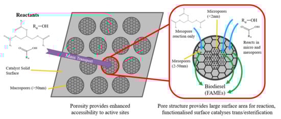 As an inert catalyst support, silica facilitates the production of materials with impressively large surface areas and highly porous, nanoscale channel networks. The ability to tune pore size distribution and functionalize the surface with a wide range of metal oxides and sulfated groups has produced many solid acid catalysts for biodiesel production. A summary of some of these recent developments over time is included in Table 5. As per IUPAC definitions, pore sizes can be classed as either microporous (<2 nm diameter), mesoporous (2–50 nm) or macroporous (>50 nm) [117]. Macropores facilitate high mass transfer rates of reactants into the internal nanoscale structure, while meso/micropores provide substantial reaction surface area for catalysis to occur. Since triglyceride molecules are typically 2–6 nm in molecular diameter [23,51], only esterification can occur in micropores, whereas both transesterification and esterification are achievable in mesoporous nanochannels, as illustrated in Figure 11.