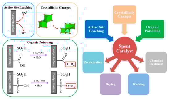 Recyclability remains a challenge, despite new catalysts being regularly developed. Deactivation can occur due to a variety of reasons and different regeneration approaches have been tried to extend activity, as illustrated in Figure 13. Washing and drying steps can be used to remove organic depositions that poison the catalyst surface which, followed by recalcination, can also help to remove organic impurities. Recalcination may also be required should loss of crystallinity have occurred during reaction. While it is important that leaching be minimized to ensure adherence to biodiesel specifications, small losses of metal cations and acidic sulfate groups will unavoidably occur over extended use. Therefore, chemical treatments could be utilised to replace catalytically active species and restore activity. As has been noted by other literature studies [139], spent catalytic material is often not characterised to determine how material properties change post-reaction, thereby regrettably missing the opportunity to learn more about the specific deactivation mechanisms dominating activity loss. It is encouraged that future studies more regularly determine the primary cause of deactivation, so as to inform development of superior catalysts designed to reduce such effects. While recent work by Gardy et al. [38,98] using SO42−/Fe-Al-TiO2 achieved high yield over an impressive 10 consecutive runs with impure WCO feed, there continues to be a strong desire to further extend catalyst lifespan without expending significant cost in material regeneration. Work involving sulfated zirconia as part of an MMO catalyst has led to encouraging improvements in recyclability and retention of sulfate groups. Likewise, while it may be that sulfated metal oxides are more suitable for conversion of cheap raw feedstocks than sulfated carbon, recent work such as the Al3+/SO42−/MWCNT catalyst synthesized by Shu et al. [56] could challenge that theory. An impressive eight consecutive uses could be performed, although it would have been preferable to see WCO used instead of model FFA oleic acid. It is hoped that similar improvements may be made over time with other types of sulfated solid acids.