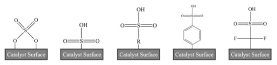 As discussed previously, nanomaterials can be functionalized post-synthesis to introduce new catalytically active functional groups, either to increase existing reactivity or provide an optimal balance of both Lewis and Brønsted acidity. On a solid surface, it is possible to achieve superacidity, defined as an acid strength greater than 100% pure sulfuric acid. This is often denoted via a Hammett acidity (H0) function value below −12 [46], and can be experimentally determined through the use of standard indicator dyes [47]. Inclusion of sulfur-based compounds onto the catalyst surface by reacting with concentrated sulfuric acid [48], chlorosulfonic acid [49] or ammonium sulfate [50] have all been well-explored methods of increasing resilience to FFA impurities, with acid loading and strength influenced by the type of sulfation agent selected. The addition of organic alkyl or aromatic groups has also been explored by using propylsulfonic and toluenesulfonic acids [51,52]. Introduction of less polar organic acid sites has been observed to reduce deposition from polar FFA impurities and hence improve reusability; however, at the potential cost of reduced activity by weaker acid strength.