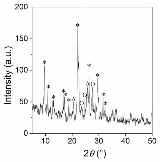 PXRD pattern of the zeolitic tuff (SCLI) (* clinoptilolite, o albite and ∆ quartz). The CEC values vary from 125.4 (TCLI) to 236.3 (RCLI) mmol M+/100 g. The chemical nature of the exchangeable cations differs, showing the effect of the type of deposits on the CLI chemical composition. It is also evident that conversion of SCLI to NaSCLI, NH4SCLI and HSCLI resulted in the enrichment of SCLI with Na+, NH4+, and H+, and in a significant decrease of the exchangeable cations in the CLI lattice.