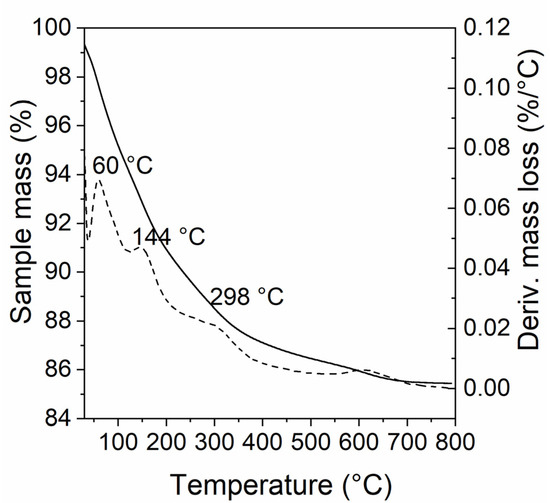 Thermal behavior of the samples is similar. A typical thermogram is shown in Figure 2. Total weight loss occurs up to 800 °C and varies from about 8.0 (ICLI) to 14.6 wt.% (RCLI), depending on the deposit. The weight loss is accompanied by several DTG maxima, indicating that the water loss is not continuous; this is due to the presence of water molecules at different crystallographic sites inside the CLI lattice.