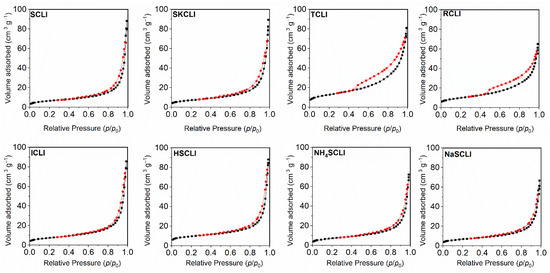 Textural properties obtained from the nitrogen adsorption/desorption isotherms are given in Table 3. The results are in agreement with the reports of other research and suggest that differences in porosity are due to different deposits [35,36]. It is evident that the specific surface area (SBET) varies from 23.0 to 45.1 m2 g–1 and Vmic from 0.0978 to 0.1357 cm3 g–1. Moreover, there is no significant change in SBET after the conversion of SCLI to NaSCLI and NH4SCLI in contrast to the conversion to HSCLI (SBET increases from 23.0 to 33.0 m2 g−1). The increasing values can be explained by a partial dealumination during the conversion of SCLI to HSCLI. Dealumination of the aluminosilicate lattice leads to the opening of the pores [35,36,37] and can increase the specific surface area.
