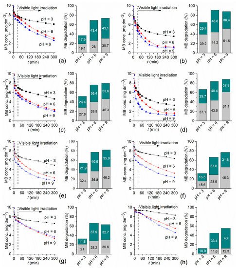 Photodegradation of aqueous solutions of MB (C0 = 10 mg dm–3) was performed under irradiation with visible light (Figure 5). Since pH is one of the most important factors of photodegradation, photocatalytic tests were performed at different pH values (3, 6, and 9).