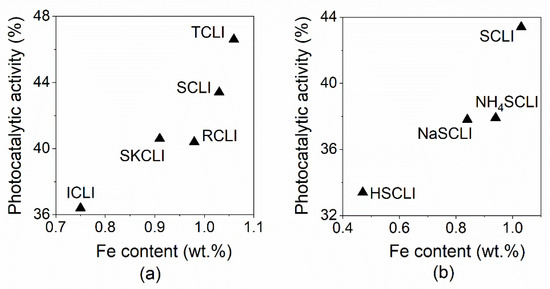 To get an insight into the photocatalytic performance of the samples, the iron content was determined in all studied samples. It varies from 0.75 wt.% (ICLI), 0.91 wt.% (SKCLI), 0.98 wt.% (RCLI), 1.03 wt.% (SCLI), to 1.06 wt.% (TCLI). It can be concluded that the photocatalytic activity increases with an increase in the iron content (Figure 6a), and this suggests that the iron species could be responsible for the photocatalytic degradation of MB. The relationship is nearly linear (R2 = 0.9).