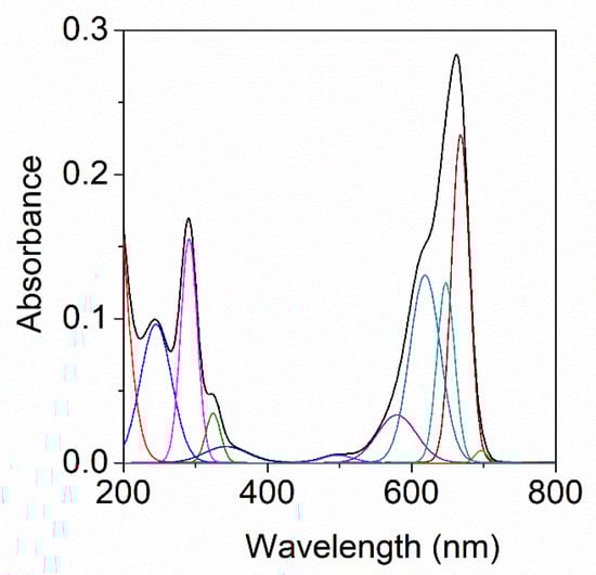 Figure 7 shows the representative spectrum obtained by deconvolution. The peaks associated with MB are noticeable in the visible region at 664 nm and can be ascribed to the MB monomer (i.e., a conjugate system formed connection of two dimethylamine substituted aromatic rings via N and S) with a small shoulder at 612 nm, which is due to the MB dimer [46,47]. Two additional peaks observed in the ultraviolet region (located at 245 and 292 nm) correspond to substituted benzene rings [46,47]. According to the literature data, the main mechanism pathway includes demethylation of MB, which proceeds through formation of intermediate species Azure B (648–654 nm), Azure A (620–634 nm), Azure C (608–612 nm), and Thionine (603 nm) [45,48]. The Gaussian peaks at ~668 nm (red), ~648 nm (azure), and ~623 nm (light blue) are present in all spectra and can be ascribed to MB, Azure B, and Azure A, respectively. The difficulty of ascribing the degradation products based on UV-vis spectra is increased since Azure A and B contain the same peaks. The solution was solved by taking into account that the ratio between peaks at absorbance of the peak at ∼650 nm to the absorbance of the peak at 609–614 nm is 1.15 for azure B, and 0.34, for azure A [45]. Hence, an estimation of the content of the two products could be made. The fact that similar degradation products were registered for all tested samples supports the suggestion that the iron species present in all zeolite samples are responsible for MB degradation. Similar results were reported for commercial TiO2 [45,48] and natural manganese oxides [49,50].