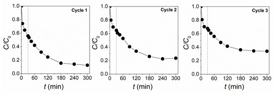 Recyclability of the photocatalyst in the MB photodegradation. Reaction conditions: C0 = 10 mg dm–3, photocatalyst dosage = 0.2 g dm–3, pH = 6, and t = 300 min.