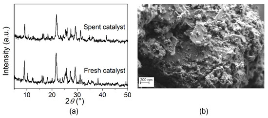 (a) PXRD patterns of fresh and spent photocatalyst and (b) SEM image of photocatalyst at the end of photocatalytic process.