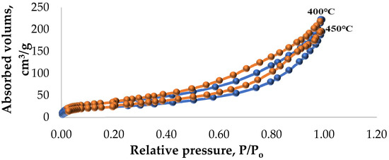 Nitrogen adsorption–desorption isotherms of PEG2 calcined at 400 °C and 450 °C.