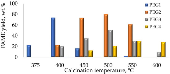 To determine the effect of PEG content and calcination temperature on catalytic performance, each PEG1–PEG4 precatalyst was calcined at a different temperature. As shown in Figure 5, sharp maxima of the FAME yield were registered for the PEG1 catalyst at 400 °C, for the PEG2 catalyst at 500 °C, for the PEG3 catalyst at 500 °C, and there was a flatter maximum for PEG4 at 550 °C.