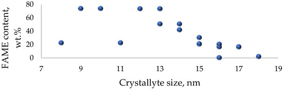 Relationship between FAME yield and crystallite size. The main crystallite size is calculated using (200) and (220) reflections using the Scherrer equation (Table S1).