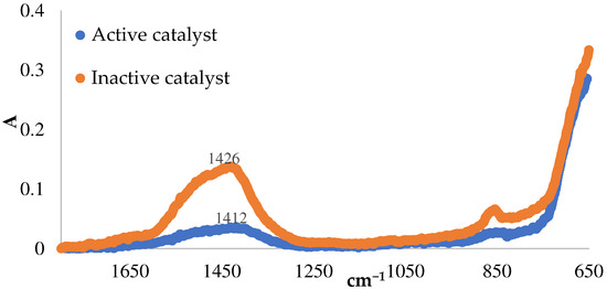FTIR spectra of active (PEG2 crystallite size 13 nm, FAME 73.5%) and inactive (PEG1 crystallite size 8 nm, FAME 22.5%) catalysts.