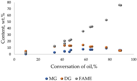 Chromatographic analysis shows that the main constituents of the obtained reaction mixtures were FAME, MG, DG, and TG, if the amount of G did not exceed 1 wt.%. The sum of these components was usually 97–100%, which allowed us to consider that the amount of unknown by-product was insignificant. Assuming that the reaction mechanism was provided by the same active sites in all cases, the change in the composition of the reaction products depending on oil conversion should reflect the gradual realization of the transesterification. As follows from Figure 8, the experimental points form logical curves that confirm the presence of the same active sites in all cases.