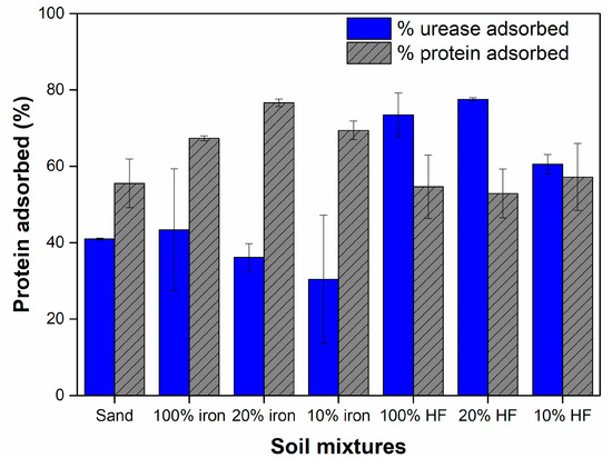 No significant differences were found in the percentage of adsorbed urease among iron-containing mixtures, even when compared to sand (p-value > 0.05). In addition, our results indicate that urease adsorption onto sand- and iron-containing soil mixtures was less favorable in comparison to the total proteins in the mixture. It is unclear if increased iron contents had a more detrimental effect on urease adsorption, but previous studies have found low levels of urease adsorption onto clay minerals coated with iron [22]. Studies have found that the presence of urease is negatively related to the amount of iron present, either in natural soils or in experimental settings [60].