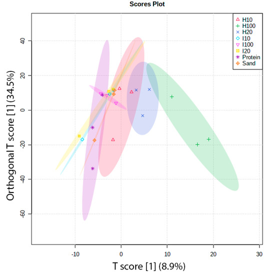 A score plot for all proteins present in the initial total protein extract and in supernatant portions of samples following adsorption. The score plot employs the orthogonal projections to latent structures discriminant analysis (OPLS-DA) modeling method and was developed through the MetaboAnalyst online tool [63]. Displayed regions reflect a 95% confidence interval. Prior to analysis, the data was log transformed and auto-scaled (mean centered and divided by the standard deviation of each variable). Sand = uncoated sand; Protein = initial protein sample; I10, I20, I100 = 10, 20, and 100% iron-coated sand, respectively; H10, H20, H100 = 10, 20, and 100% hydrophobic sand, respectively.