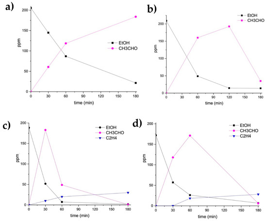 The reaction profiles of ethanol photo-oxidation using the monometallic samples are reported in Figure 1a,b.