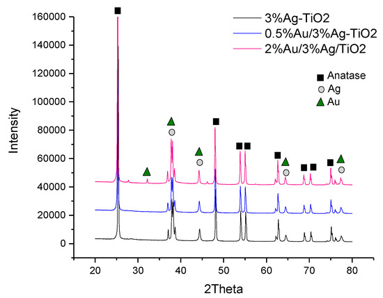 XRD analyses (Figure 3) were performed on the monometallic 3%Ag-TiO2 and on the corresponding bimetallic samples.