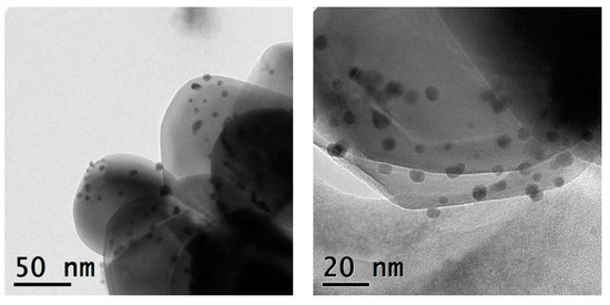 Together with a large population of particles with a size <10 nm, significantly larger particles could be observed (Figure 8). The bimetallic 0.5%Au/3%Ag-TiO2 sample showed nanoparticles with a mean diameter of d = 4.7 ± 13.2 nm.