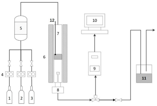 Schematic diagram of H2S catalytic process: (1) 1% H2S gas cylinder; (2) N2 gas cylinder; (3)O2 gas cylinder; (4) mass flow controllers; (5) gas mixer; (6) tube furnace; (7) fixed bed reactor; (8) condenser; (9) gas chromatograph; (10) computer; (11) NaOH wash bottle; (12) thermocouple.