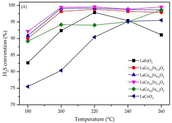 The effect of reaction temperature on the catalytic performance of the LaFexCo1−xO3 catalysts for H2S selective catalytic oxidation is investigated in Figure 2. Figure 2A shows the H2S conversion for LaCoO3, LaFeO3, and Fe-doped LaCoO3. At 180 °C, LaCoO3 can only achieve H2S conversion of 75%, while LaFeO3 achieved slightly higher H2S conversion of 83%. With Fe co-doping in the B-site, H2S conversions were significantly higher, and all samples achieved conversions higher than 88%. This indicates that B-site Fe doping significantly increases the activity of the pristine perovskite catalysts. Temperature effects were also investigated. For LaCoO3, it was shown that H2S conversion increased with temperature and eventually reached 93% at 260 °C. For co-doped LaFe0.4Co0.6O3, LaFe0.6Co0.4O3, and LaFe0.8Co0.2O3, H2S conversion increased to 99% at only 200 °C. This again shows that LaFexCo1−xO3 with Fe doping has notably higher activities. For LaFeO3, the H2S conversion increased and then decreased with the further increasing temperature. This could be ascribed to lattice oxygen uncoupling from the perovskite structure at higher temperatures, which caused a loss of activity of perovskite [25].