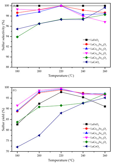 Figure 2B compares the selectivities towards sulfur. It was observed that LaFeO3 exhibited almost perfect selectivities (~100%) at all temperatures investigated, while LaCoO3 exhibited lower selectivity, with ~95% at 180 °C. A small amount of Fe doping did not increase the selectivity, and 94% sulfur selectivity was achieved for LaFe0.2Co0.8O3 at 180 °C. However, a further increase in Fe contents significantly increased the selectivities, and >98% selectivities were achieved for LaFe0.4Co0.6O3, LaFe0.6Co0.4O3, and LaFe0.2Co0.8O3. This again shows that larger Fe co-doping is beneficial. Temperature effects were also investigated. For LaCoO3 and LaFe0.2Co0.8O3, the selectivities increased with respect to temperature. For LaFe0.4Co0.6O3, LaFe0.6Co0.4O3, and LaFe0.2Co0.8O3, a volcanic shape was present and the highest selectivities (~100%) were obtained at 220 °C. Sulfur yield was further compared in Figure 2C. As expected, LaFe0.4Co0.6O3, LaFe0.6Co0.4O3, and LaFe0.2Co0.8O3 achieved ~100% sulfur yield at 220 °C, higher than LaFe0.2Co0.8O3, LaFeO3, and LaCoO3. This shows that perovskites with Co and Fe co-doping are highly effective in H2S selective oxidation to sulfur.