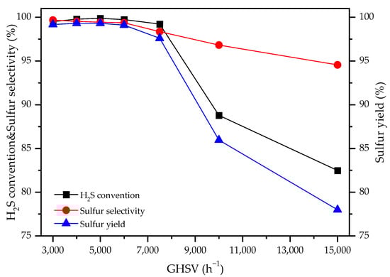 LaFe0.4Co0.6O3 was selected as one of the best catalysts for selective H2S oxidation. The influence of GHSV on the performance of the LaFe0.4Co0.6O3 catalyst was investigated at 220 °C. As shown in Figure 3, the H2S conversion, sulfur selectivity, and sulfur yield were all above 99% when the GHSV was in the range of 3000 h−1–6000 h−1. However, it was found that as the GHSV further increased, the catalytic activity of LaFe0.4Co0.6O3 catalyst was greatly reduced. H2S conversion decreased from 99% to 82% with the increase in GHSV from 6000 h−1 to 15,000 h−1. Therefore, LaFe0.4Co0.6O3 presented excellent catalytic performance in the GHSV range of 3000 h−1–6000 h−1.