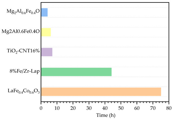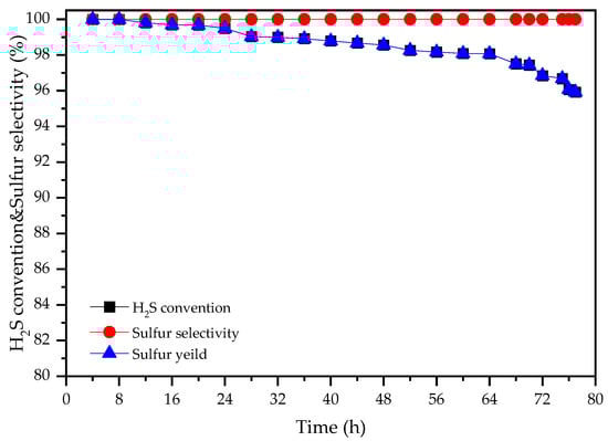 Catalyst stability is an important criterion for industrial applications. Figure 5 illustrates the durability behavior of the LaFe0.4Co0.6O3 catalyst at 220 °C. The selectivity of sulfur can be maintained at ~100% with the reaction proceeding within 77 h. For catalyst activity, during the first 64 h, the H2S conversion of the LaFe0.4Co0.6O3 catalyst decreased slightly from 99.9% to 98.1%. The deactivation accelerated after 64 h; however, H2S conversion was still above 95% at 77 h. Longer reaction time was not attempted given the limitation of the lab equipment. Although deactivation was still observed, the co-doped LaFe0.4Co0.6O3 catalyst exhibited excellent stability when compared with several other reported catalysts using a 5% decrease in sulfur yield as a criterion. The comparisons with previously reported carbon materials, pillared clay materials, and metal oxides are shown in Figure 6 [2,7,13,26,27].