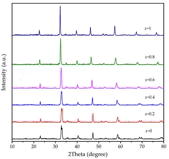The phase structures of all catalysts were examined by XRD. Figure 7 shows the XRD patterns of LaFeO3, LaCoO3, and LaFexCo1−xO3 catalysts. It was observed that co-doped LaFexCo1−xO3 generally maintained a perovskite-phase structure. With increasing amounts of Fe (III) dopant, a small shift to lower 2-theta angles was observed, indicating that Fe3+ is substituted into the perovskite structure. For x = 0, 0.2, and 0.4, there is a clear reflection peak splitting at 59.4°, consistent with the spitting of the main peak at 33°. For x = 0.6 and x = 0.8, the peak splitting effect has become less apparent, but the peak shape is still asymmetric. It is noted that the peak splitting effect is minimal on LaFeO3, with no Co-doping. This behavior is mainly due to the transformation of the phase structure from a rhombohedral structure of LaCoO3 (PDF 84-0848) to a cubic structure of LaFeO3 (PDF 75-0541) with Fe3+ dopant.